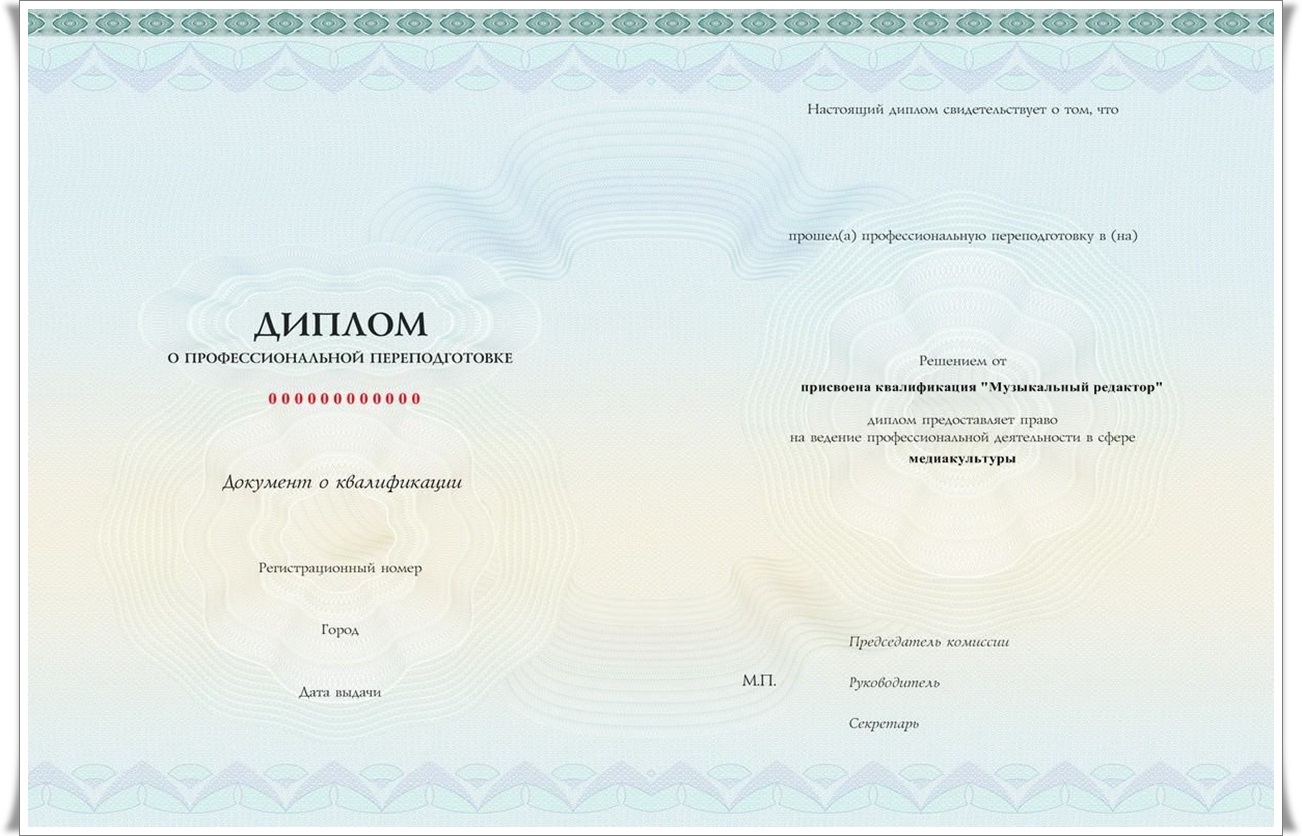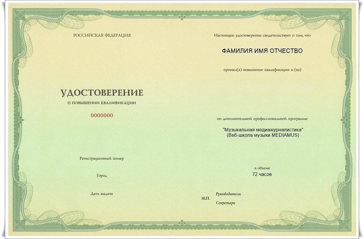 По прохождении краткосрочного курса и итоговой аттестации выдаётся Удостоверение о повышении квалификации установленного образца в объёме 72 ч. По прохождении трёх краткосрочных курсов (комплексного курса профессиональной переподготовки "Музыкальная медиакультура") и итоговой аттестации выдаётся Диплом о профессиональной переподготовке установленного образца в объёме 250 ч. о присвоении квалификации "Музыкальный редактор". Удостоверения и дипломы высылаются заказным письмом в течение 3-12 дней после прохождения итоговой аттестации. Документы учитываются при аттестации педагогических работников и работников учреждений культуры и искусства в целях установления квалификационной категории и/или с целью подтверждения соответствия работника занимаемой должности (в соответствии с Приказом Минобрнауки России от 07.04.2014 № 276 и Письмом Минкультуры России от 08.02.2010 № 7790-44/04-ПХ).